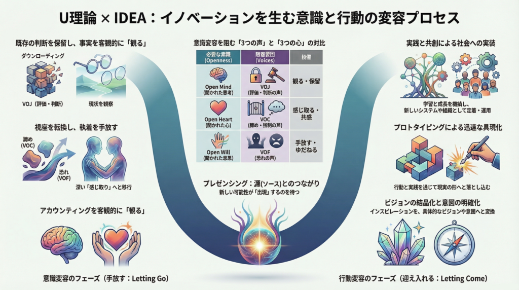 私たちは、U理論をベースにした意識と行動の変容プロセスを活用し、個人や組織の創造性を引き出し、新たな価値創出につなげる支援サービスを提供しています。変化の激しい時代においては、従来の延長線上の発想だけでは競争力を維持することが難しくなっています。そのためには、単なるノウハウ習得ではなく、思考の前提そのものを見直し、より深いレベルから発想を生み出すアプローチが重要になります。